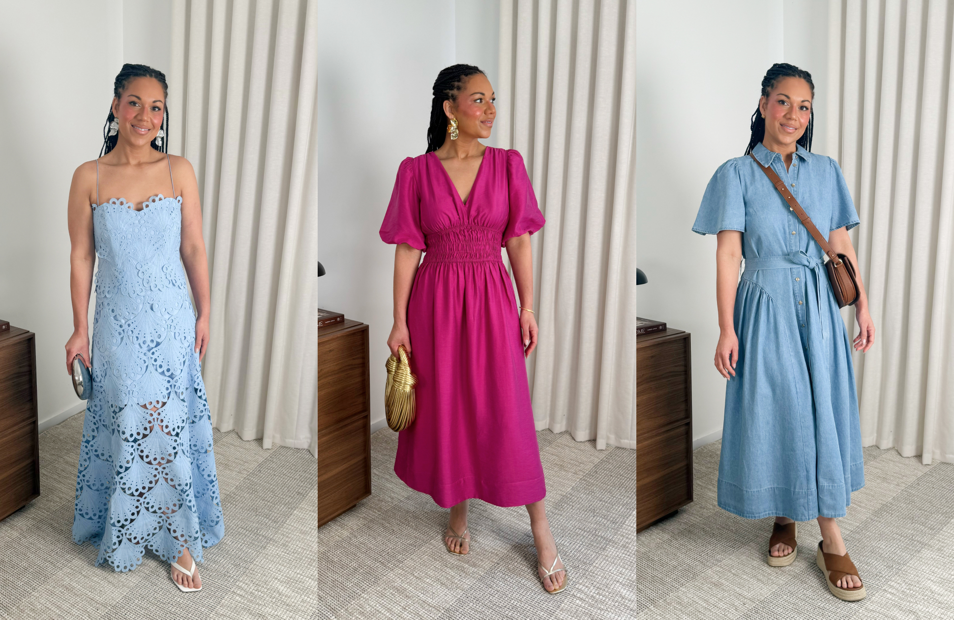 Easy to dress up or down, a flowy dress makes for the perfect day-time event and is a must-have for the holiday season. There are limitless options for what this dress can be, depending on your own style and preference. Emelia suggests that you can't go wrong with a denim midi shirt dress or a flowing, breathable tiered linen dress to work with the warm weather. These options are comfortable, timeless and versatile enough for brunches or a relaxed afternoon gathering with friends. Complete the look with a pair of slides or wedges and a cross-body bag in matching neutral tones. To keep on-trend, add a fun printed scarf to your bag for a little something extra.