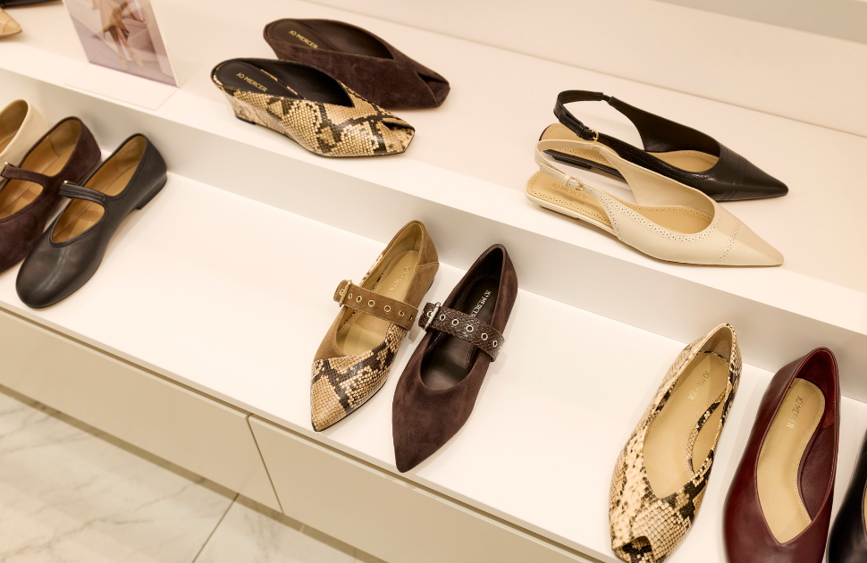 Jo Mercer’s latest footwear drop includes pointed‑toe ballet flats in versatile shades of beige and brown, finished with eyelet detailing and trending faux snakeskin textures. They’re the ideal elevated flat for workdays, weekends or dressing up denim.